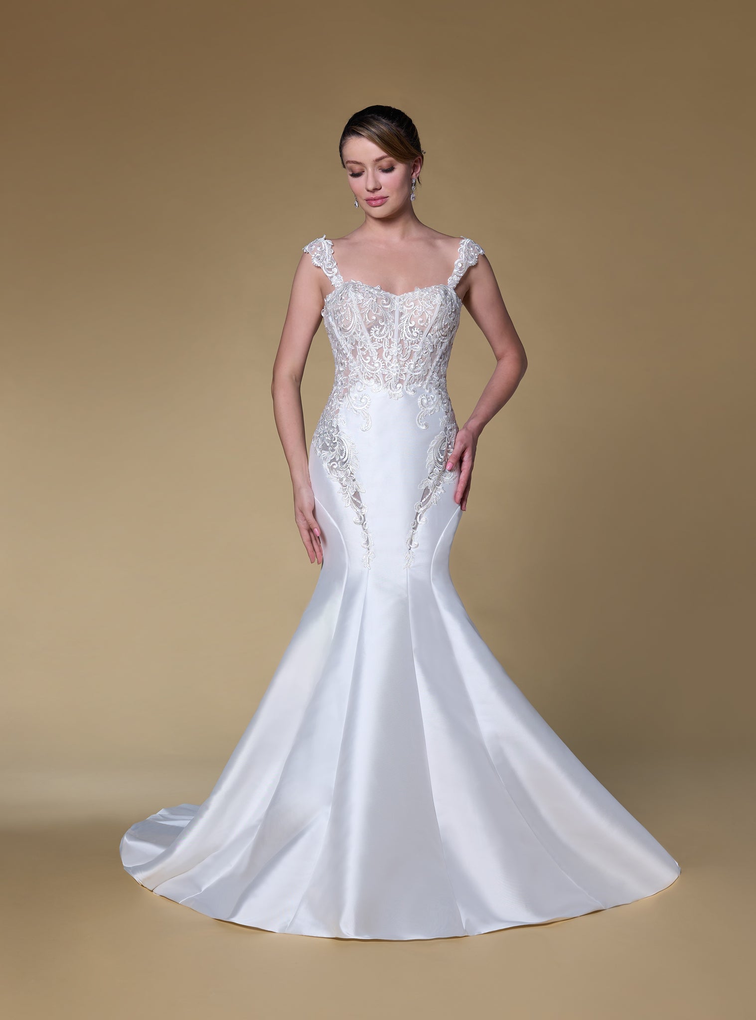 This modern mermaid wedding dress is made from luxurious Mikado—a refined fabric historically worn by Japanese royalty. The gown features a romantic sweetheart neckline and a corset bodice applied with delicate lace motifs. A subtly sensual, sheer sculpting detail traces the hip line to enhance the feminine silhouette. The versatile sleeves may be worn on or off the shoulder to suit your desired look. The mermaid skirt flows with contoured lines, extending into a chapel-length train creates an elongated, slimming look. Sheer back bodice with a concealed zipper closure adds an elegant finishing touch.