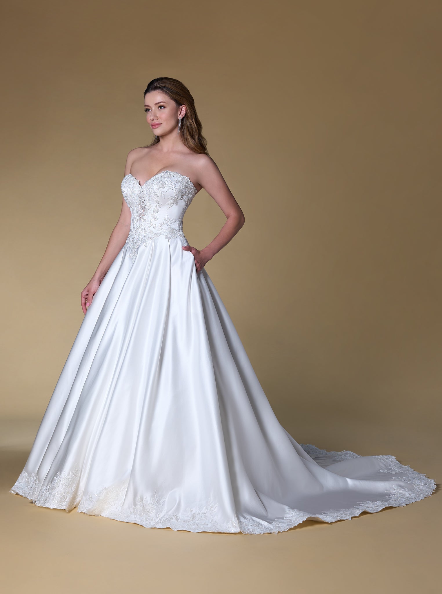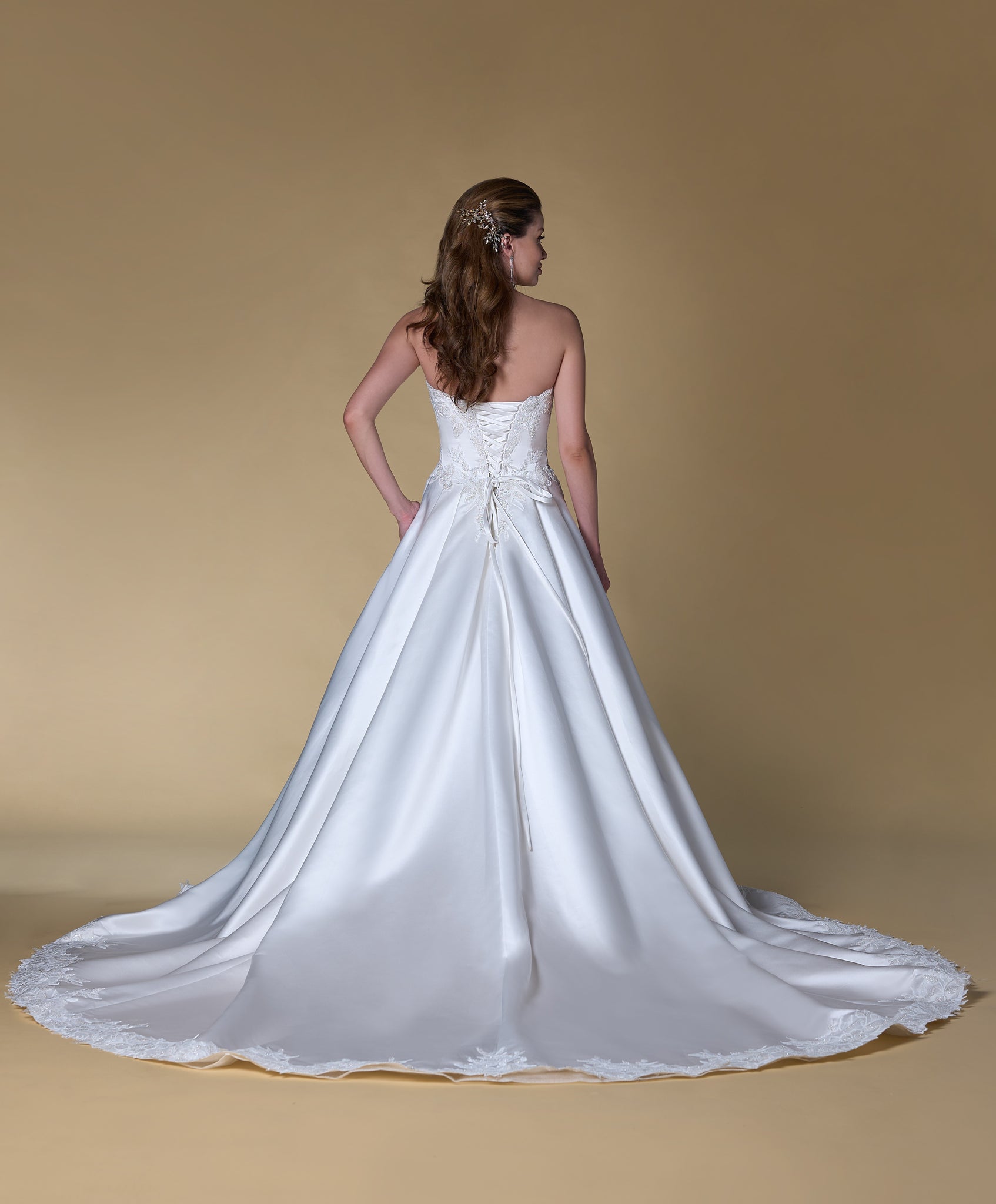 Elegant silky satin A-line wedding dress. Sweetheart neckline, plunge V cut front covered by the lace applique adding a touch of romance and sophistication. The Basque waistline beautifully accentuates the natural curves of the waist, while the lace-up back allows for a customizable fit. The flowing skirt gracefully extends into a chapel-length train, creating a timeless bridal silhouette. Designed with built-in bra pads, supportive boning, and convenient pockets, this gown blends beauty, comfort, and practicality.