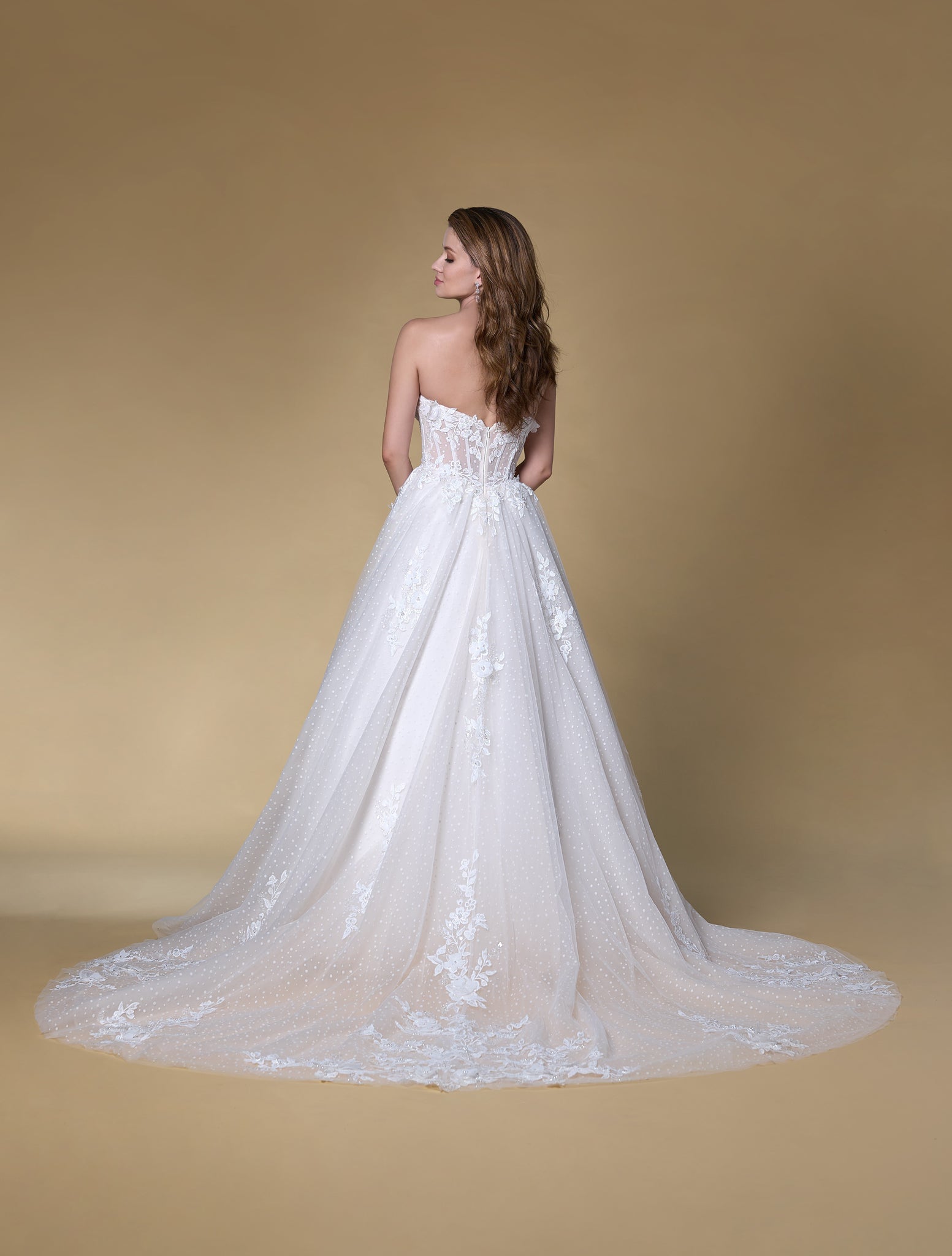 Crafted from soft tulle and delicately layered over Point d’Esprit, it creates an ethereal, princess-like allure. The sweetheart neckline features a plunging center, the transparent corset bodice adds a touch of modern romance. beaded 3D floral lace cascades gracefully from the waistline over the tulle ball gown skirt, flowing into a chapel-length train with lace that resembles a garden in full bloom. The way the fabrics are layered gives the dress an airy, crystal-like translucence that feels both dreamy and enchanting. Finished with a clean zipper back closure, and the detachable bubble long sleeves, this gown is a fairytale brought to life.